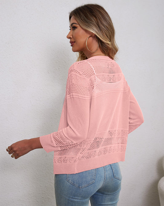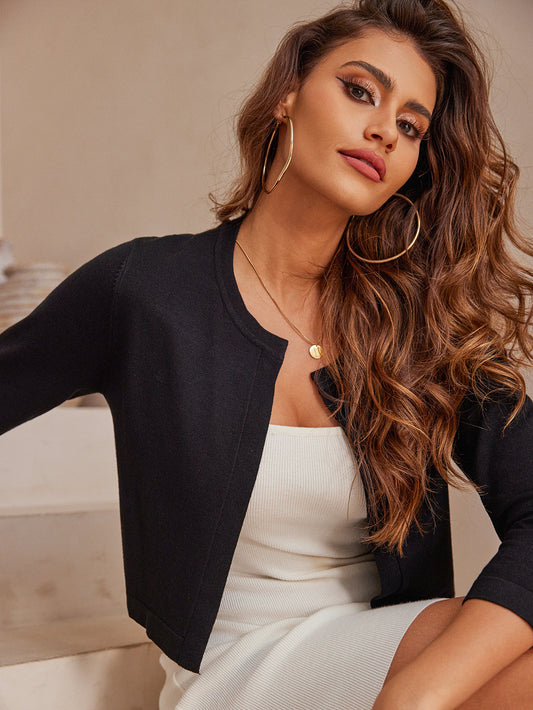 Solid Cropped 3 4 Sleeve Open Front Cardigan Sweater